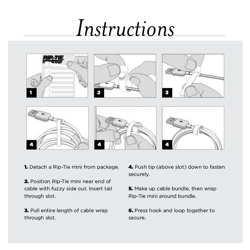 Any small cable bundle can be controlled with the Rip-Tie mini. Perfect for USB adapter cables or earbud cords.Each package contains a quantity of seven 1/4 x 3-1/2″ wraps. Available in bulk quantity packages of 56, 252, 1008 and 2016 bulk packs for commercial applications. Tested for up to 200 release cycles.