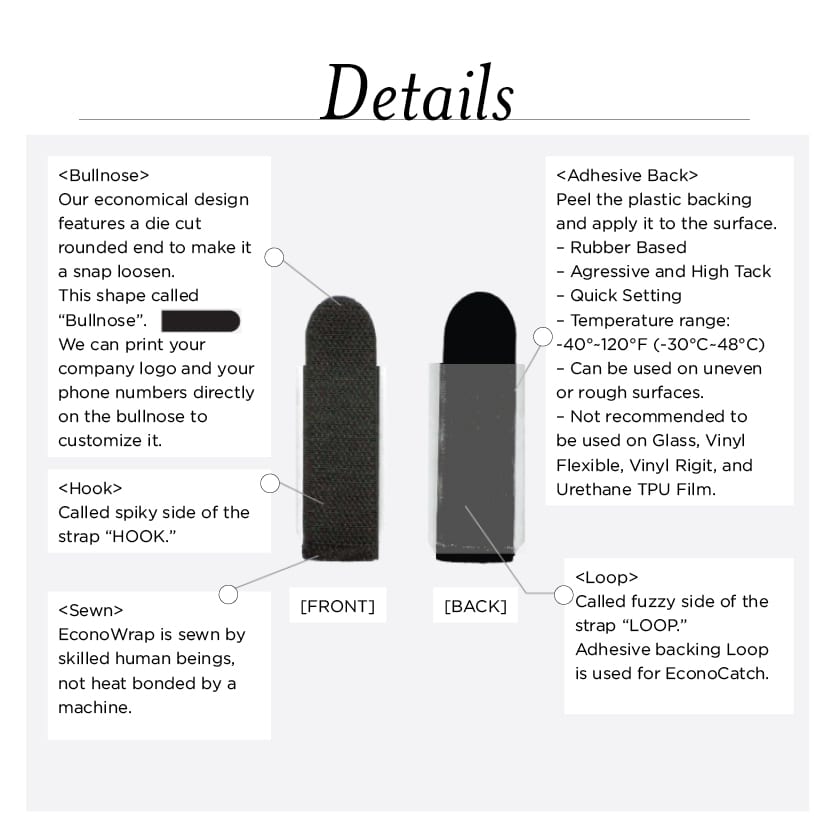 The EconoCatch organizes cables against any smooth surface. The rubber-based adhesive back allows for attachment to desks, walls, computers and other kinds of equipment.