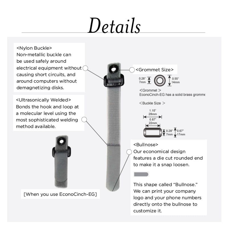 The EconoCinch-EG features a brass grommet with an ID of 1/4″. It can be attached with a metal fastener to walls, carts, equipment racks or van interiors. Like the EconoCinch, it features a non-metallic buckle.