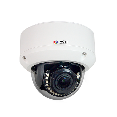 Securely monitor your surroundings with the white A810 5MP Outdoor Network Dome Camera from ACTi. This unit uses a 1/2.8" progressive scan CMOS image sensor to capture 2592 x 1944 resolution video at 30 fps. IR LEDs provide up to 49' of night vision. The camera's 2.7-13.5mm varifocal lens delivers a 101.1 to 30.4° horizontal angle of view. Two-way audio is possible thanks to an audio input and output. Integrated PoE technology simplifies connectivity by transferring data and power through a single cable.