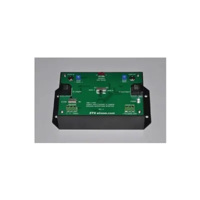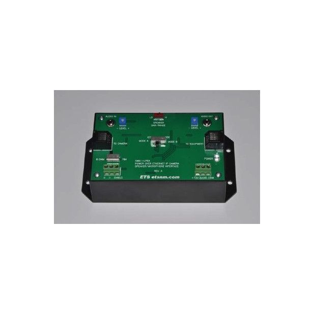 Two-way audio In line adaptor for tapping power off Ethernet powered I/P cameras to supply power to ETS Sound Surveillance speaker / microphones. Built-in 2.5W speaker power amplifier and terminal blocks for connecting ETS SM1 series microphones and 8 Ohm or 70V speakers. 3.5mm (or RCA) input / output jacks for connections to "microphone" / "line input" and "line output" of I/P cameras. Supports both modes A and B of IEEE802.3af