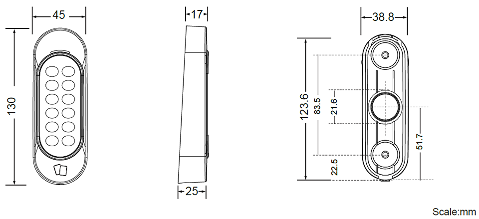 The 84-DFK1355-0010 is a slim-profile keypad reader that supports both PIN code and access card authentication. This makes it ideal for installation on narrow door frames or in tight spaces. With Wiegand and RS-485 interfaces, it can be easily integrated into a wide range of access control systems. Its IP66-rated enclosure ensures reliable performance in any environment. When paired with the GV-AS Bridge controller and GV-Cloud Access Control platform, it can control a single door, as it is equipped with two inputs (Exit Button and Door Sensor) and one output (Door Lock).