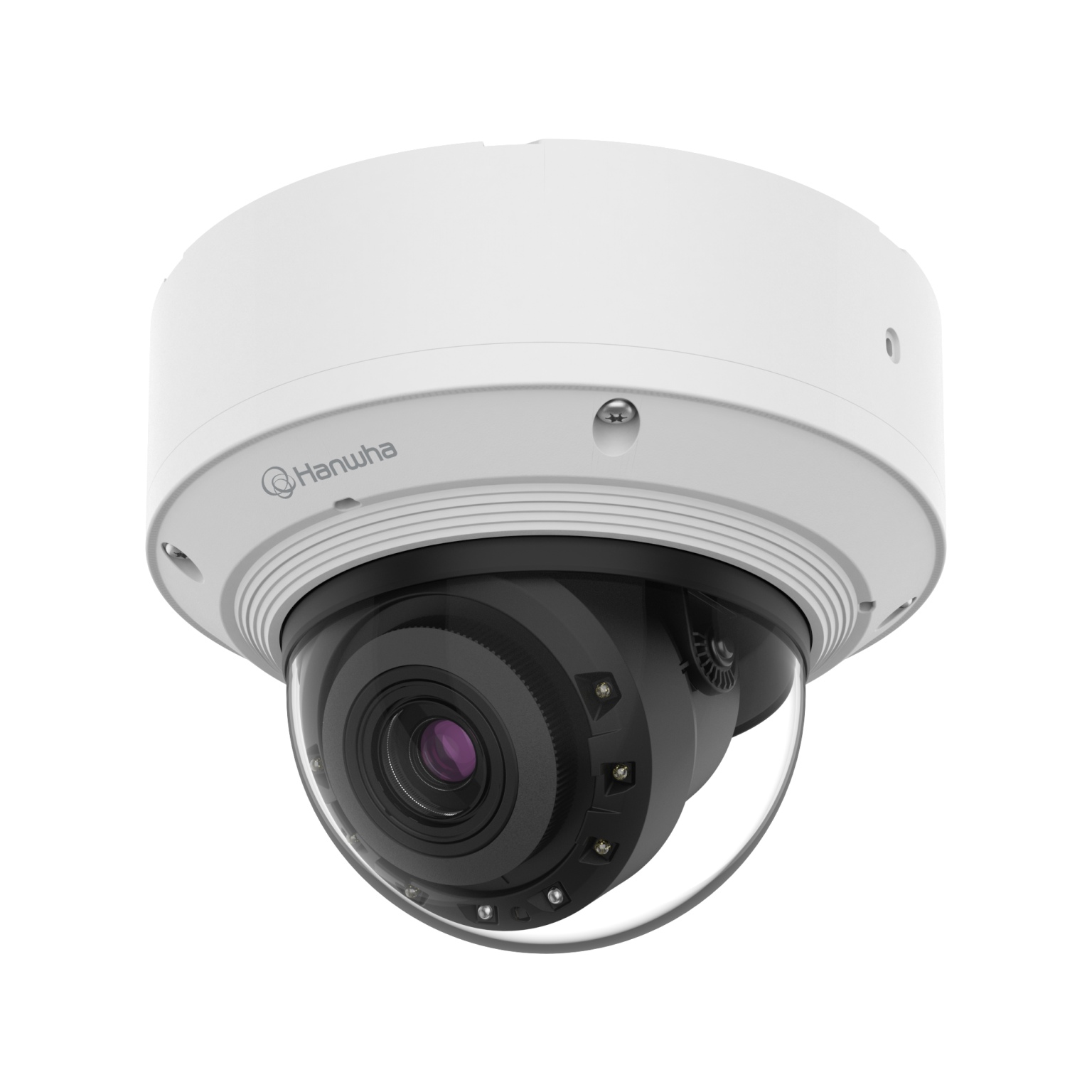 The Hanwha Vision PND-A9082RV is an 8MP AI indoor dome camera featuring a large 1/1.2" sensor and maximum 8MP resolution. It includes a 5.9~13.3mm motorized varifocal lens with long-range WiseIR up to 60m. AI-based analytics include object detection, IVA, slip&fall detection, face mask detection, and social distancing detection. Business intelligence features include people/vehicle/crowd counting, queue management, and a heatmap. The camera supports BestShot with full attributes, dynamic privacy masking, and AI-based image enhancement, including extremeWDR, WiseNR II, and WiseStream. Security features include device certificate, secure storage (FIPS 140-3 level 3/CC EAL6+ certified secure element), and SBOM. Edge storage is provided via two SD card slots. The camera is rated IP52 for dust resistance and IK10 for vandal resistance.