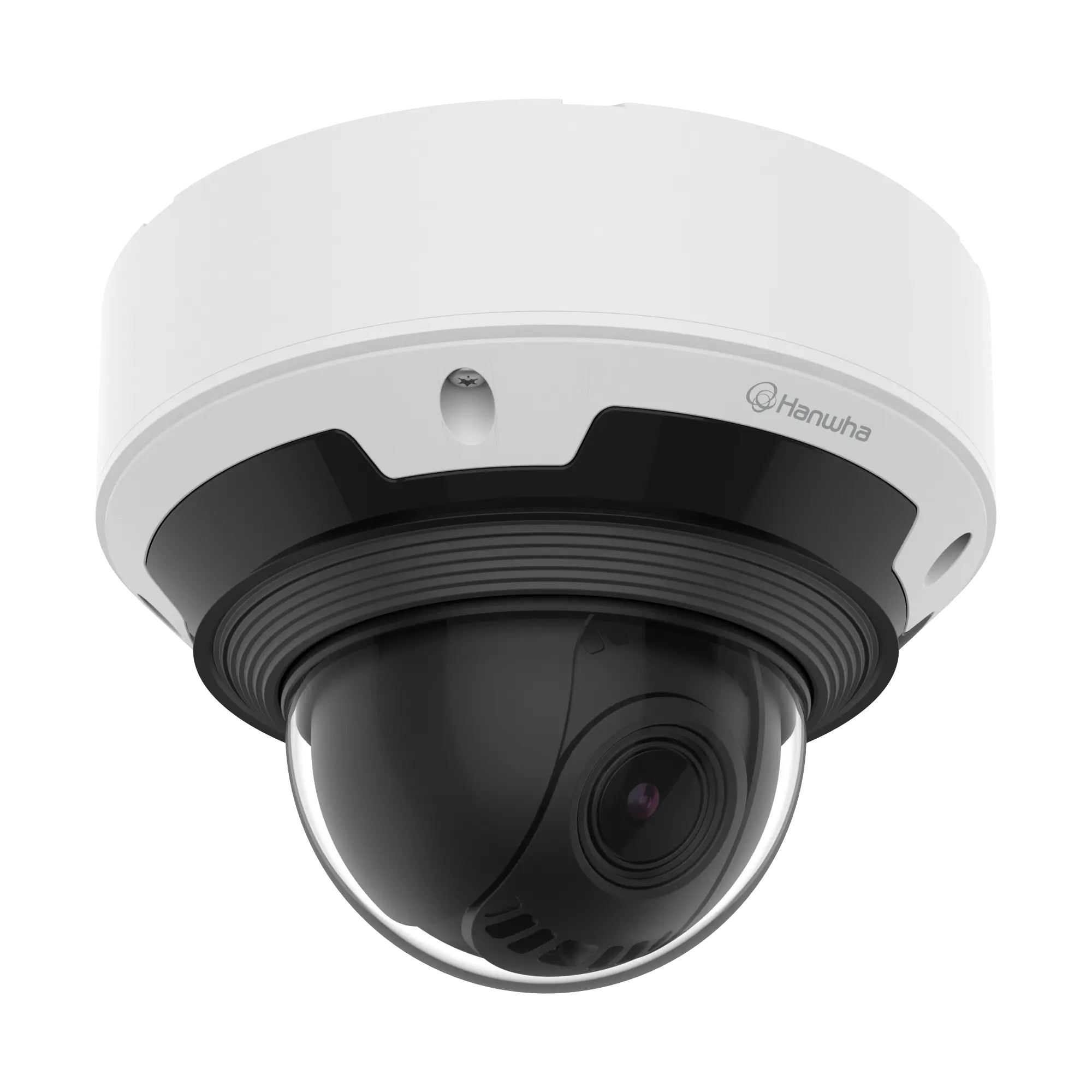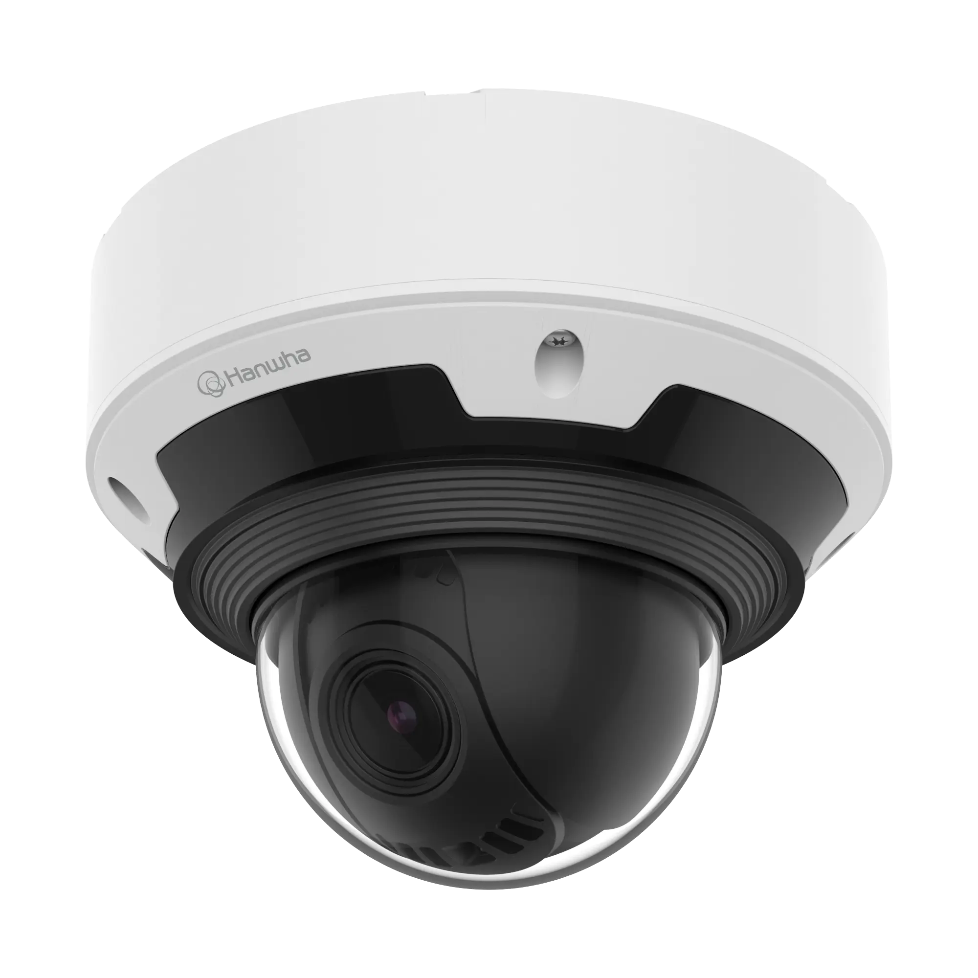 The Hanwha Vision PNV-A7082RZ is a 4MP IR outdoor vandal dome AI camera with PTRZ functionality, powered by the Wisenet 9 platform. It features a 1/1.8" CMOS sensor delivering 2592x1520 resolution at up to 60fps, a 4.6~9.35mm 2x motorized lens with a 105° to 47° horizontal FOV, and WiseIR providing 30m of night vision with 0.003 Lux B/W sensitivity. Video enhancements include WiseNR II, 120dB WDR, DIS, and defog. AI analytics include object detection of people, faces, vehicles, and licence plates, as well as virtual lines and areas. They also include face mask and social distancing detection, slip and fall detection, and business intelligence such as people and vehicle counting, queue management and heat maps. The camera is rated IP66, IP67, IP6K9K, IK11, NEMA 4X, and NEMA TS-2, operating from -50°C to +55°C. It features dual microSD slots up to 2TB total, a FIPS 140-3 Level 3 secure element, and is powered by PoE+.