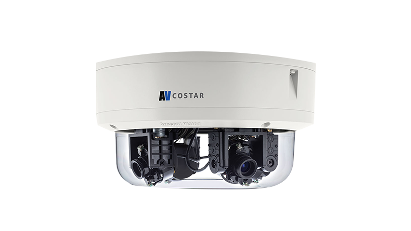 This is a multi-sensor camera housing four independent 5-megapixel sensors for a total composite resolution of 10368 x 1944 (20MP). Each sensor uses a 1/2.8" CMOS with a motorized varifocal lens offering a focal length range of 3.3–6.6mm (F1.8) and a horizontal field of view from 42° to 96° per sensor. The standard (RS) model does not have integrated IR illumination. It supports video compression in H.265, H.264, and MJPEG formats, with streams managed per sensor. The camera includes 120dB DOL WDR, day/night operation, and remote focus/zoom adjustment for each lens. It is housed in an IK-10 and IP66-rated die-cast aluminum casing. The RS model operates on PoE+ (802.3at) or 24-48V DC/24V AC, with max consumption of 25.5W, and within a temperature range of -40°C to +50°C (-40°F to 122°F).