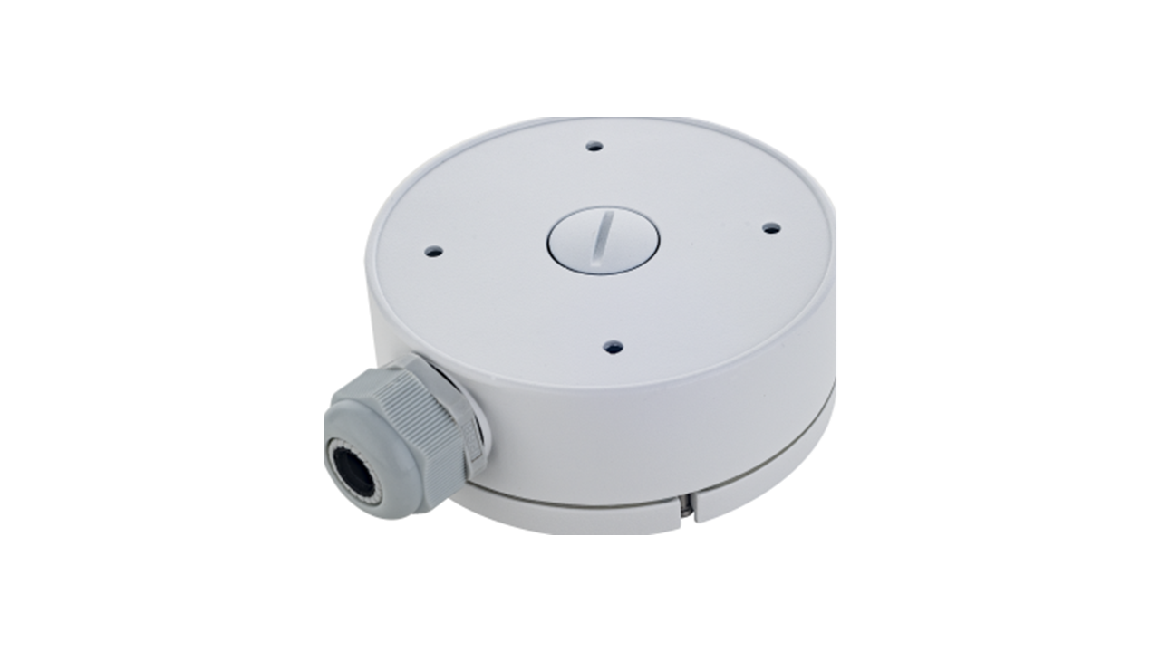 The DA-JB110A is a protective junction box designed to house and protect the external connections for a compatible IDIS camera. Its primary function is to provide a sealed, durable enclosure for managing the camera's power and network cables, protecting them from environmental exposure. Constructed from a combination of aluminum alloy and plastic, the box is built for durability and likely features weather-resistant properties. Its color is white. The specifications list the DC-D1514WER2.8 camera as a relevant model, indicating it is designed as a matching accessory for that specific camera or a similar series.