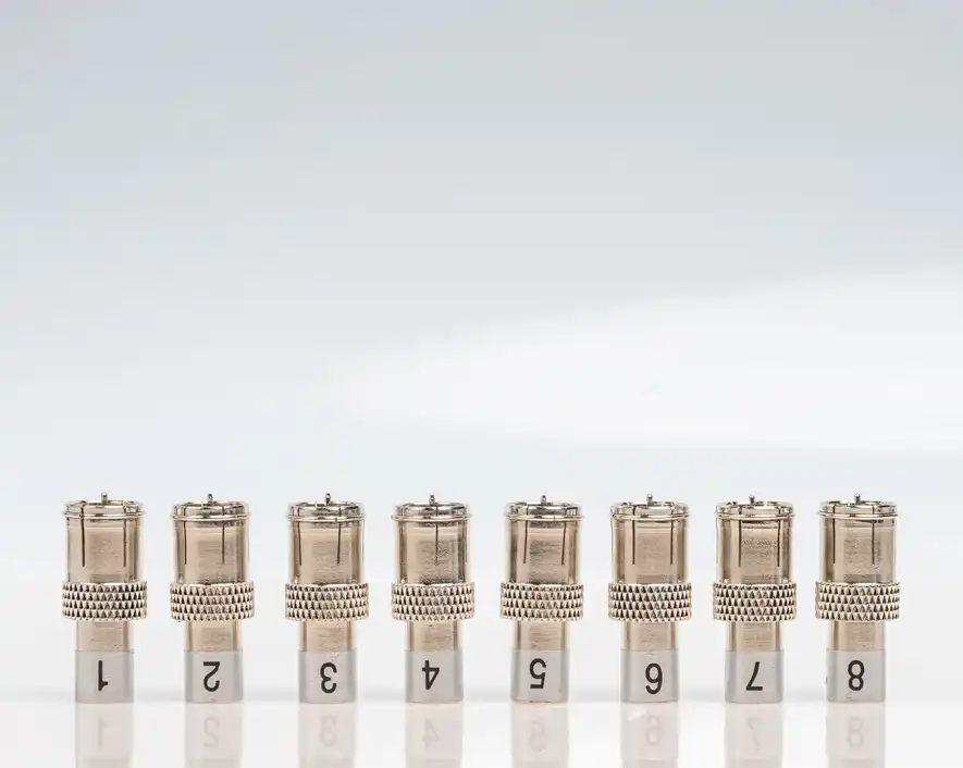 This is a set of cable identifiers, designated as Type F. The set includes 8 individual identifiers intended for use on COAX (coaxial) cables. Each identifier is compact, with dimensions of 1.50" x 0.75" x 1.50" and a light individual weight of 0.044 lb (20g). The total weight for the set is 0.16 lb (72.64g). The provided specifications are limited to physical characteristics. Information regarding the identifiers' material, specific application method (e.g., clip-on, adhesive), operating temperature, color coding, or any ingress protection rating is not specified.