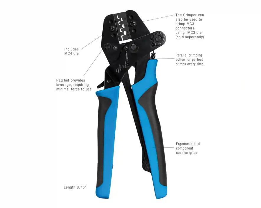 | Kit Includes | • H-20 Rugged Carrying Case • INS-475 Cabinet Slotted Insulated Screwdriver, 1/8” x 3” • SD-61 6-in-1 Multi-Bit Screwdriver with Phillips and Slotted Bits • SPC-MC4 Solar Panel Crimper with Included MC4 Die • UKN-3 Heavy Duty Utility Knife • WSC-1016 Stainless Steel Curved Wire Stripper, 6-12 AWG |