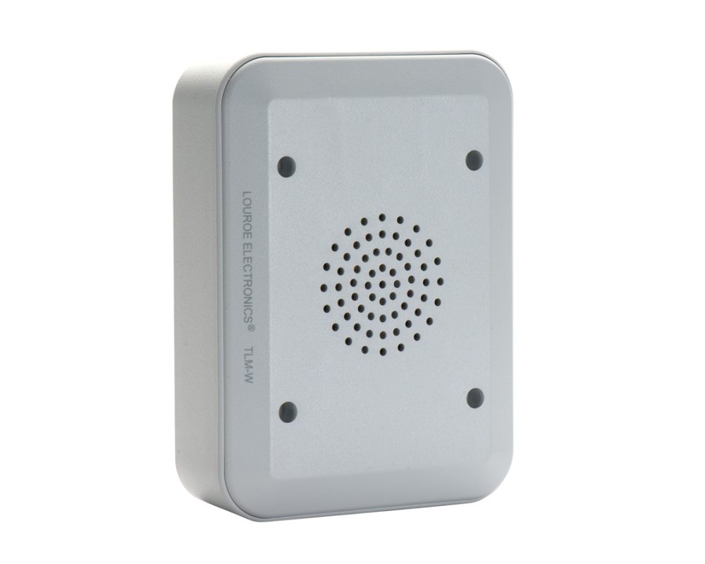 Models TLM-W is a two-way speaker/microphone with an electret condenser microphone and 2.5” speaker, all within one housing. As part of a Louroe audio system, It provides two-way communication between the remote area and the audio receiving device (Louroe Base Station, etc). Provided with the unit is a plastic back box for surface mounting to a wall.