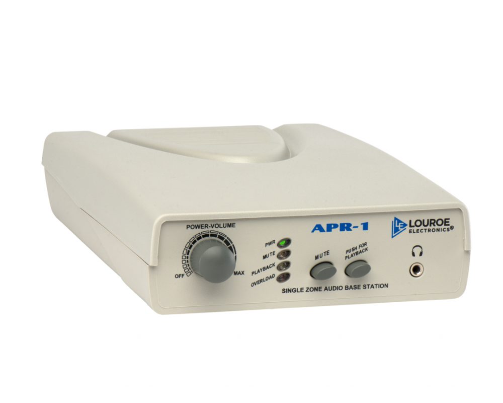 Model APR-1 is a single zone non-alarming audio base station. As a system, (with a LOUROE Microphone) it provides one-way live audio with a 3” built-in speaker. Unit contains input/out jacks for connecting to a DVR/VCR for recording and audio playback. The APR-1 has special filtering to enhance audio playback from a 24 hour time lapse recorder. Other features include adjustable volume control and 3.5mm headphone jack. All LOUROE Microphones (Models A, B, C, D, D-V, E, K and L-DT) are compatible with the APR-1