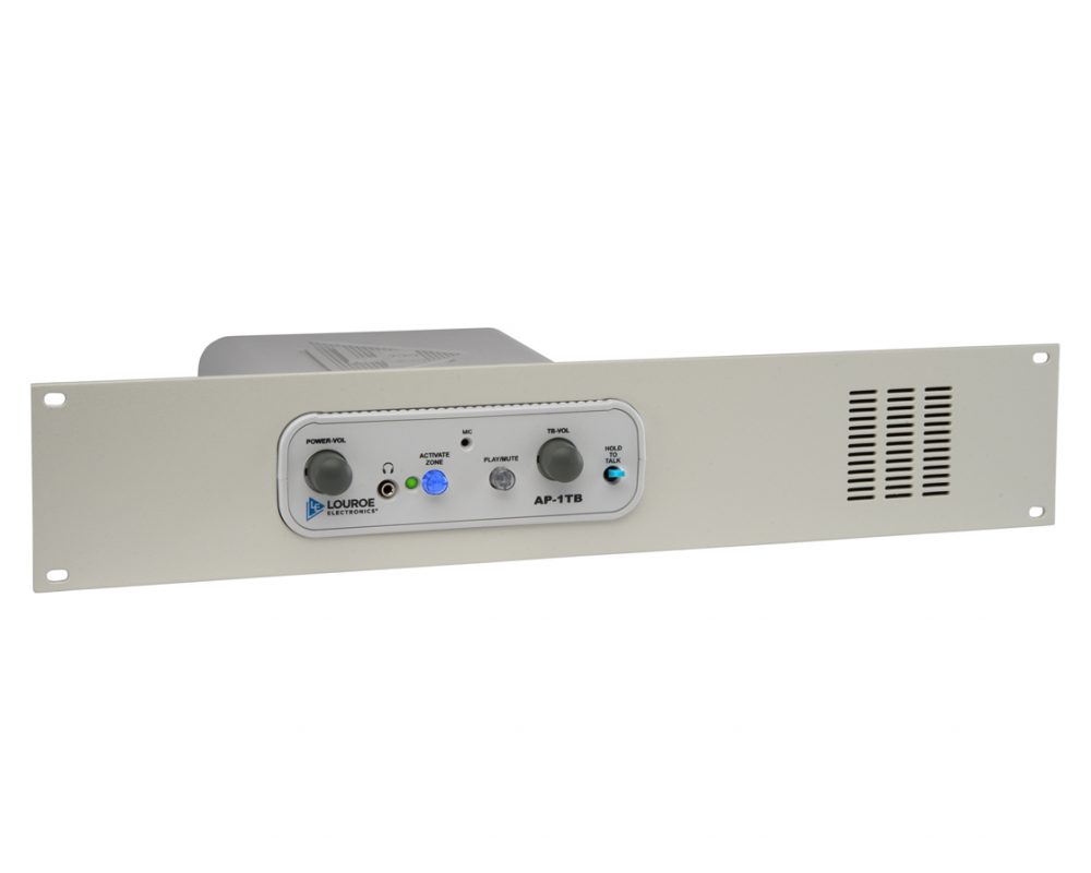 The AP-1TB-RM is a single zone rack mounted audio base station for two-way listen/talkback communication. A zone is activated by manually pressing the zone activation switch of the unit. It has input-output to a DVR/VCR for recording and playback. Contains a 3 speaker for monitoring live audio and playback from a DVR/VCR. A 12Vdc power supply is included. For two-way listen/talkback, all Louroe Speaker/Microphones (TLI, TLO, TLM, TLMC, or TLSP) are compatible