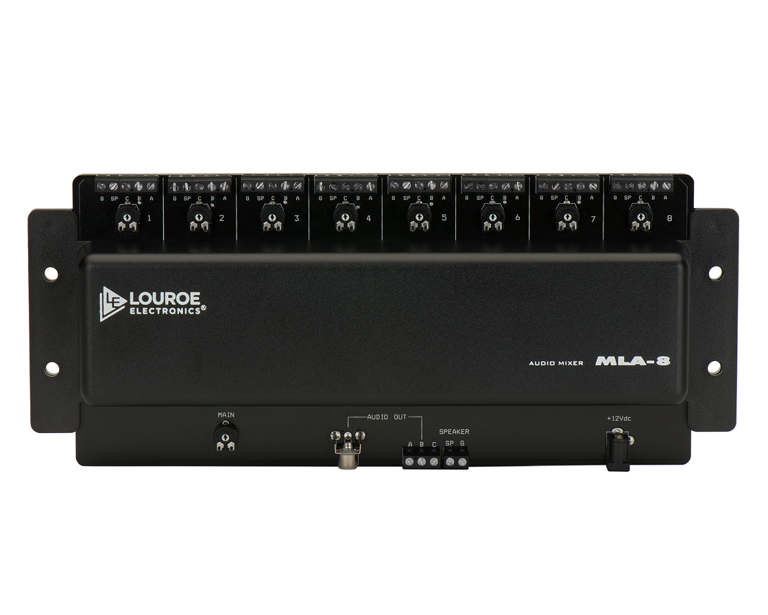 Model MLA-6 and MLA-8 are 6 zones and 8 zones respectively audio mixers used for combining six ands eight Louroe microphones or speaker/microphones for the purpose of expanding the area to be audio monitored. It has an input side (terminal block) for accepting the six or eight microphones and an output side (terminal block) for home running back to a Louroe audio base station or to other audio receiving devices. The unit contains potentiometers for adjusting the audio output from each zone and a main potentiometer for adjusting the combined outputs of all the microphones. Both units receive power from the Louroe base station or external power supply.