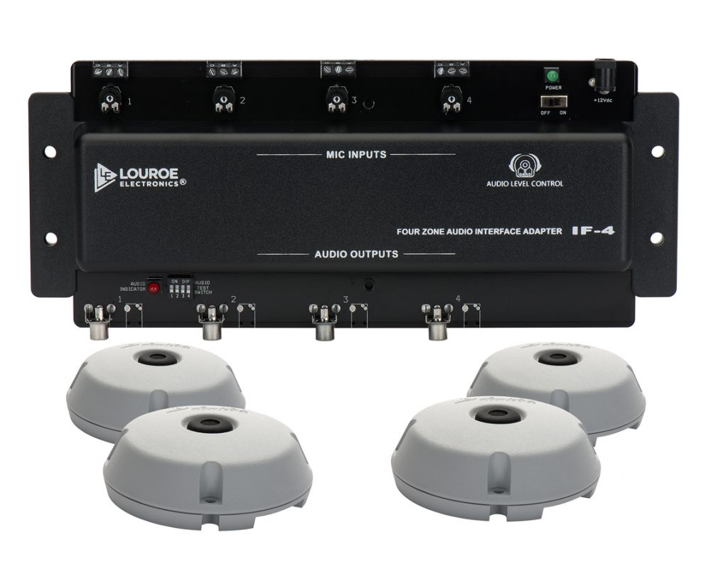 ASK-4 #304 is a four- zone audio monitoring system designed for direct connection to a DVR or IP Camera. The IF-4 audio interface adapter is designed to connect up to four Verifact A microphones, supplies power into it and drives the audio signal into the DVR, IP Cameras or Video Servers. Has adjustable gain output for each microphone to prevent overdriving the receiver. An audio test switches indicate the presence of audio at the output of the unit as indicated by the LED. The Verifact A microphones are omni-directional electret condenser type with pre-amp that produces line level audio outputs. The microphones can be up to 1000’ from the IF-4. It can pick up normal sounds approximately 15’ away all directions or 30’ diameter circle.