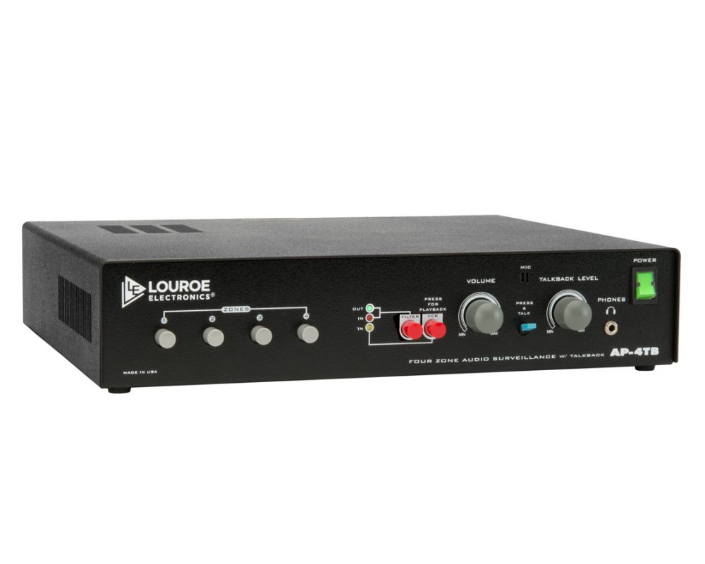 The Model AP-4TB is four zone audio monitoring base stations designed for two-way listen/talkback. As a complete system, any zone can be monitored, by pressing the button switch for the desired zone. The units contain a 3” built-in speaker for monitoring audio and a built-in microphone for talking back to the remote zone. Each zone has an audio output jack (RCA) for connection to a DVR with multiple audio inputs. All Louroe Speaker/Microphones (Model TLI, TLM, TLMC, TLSP, and TLO) are compatible with the AP-4TB
