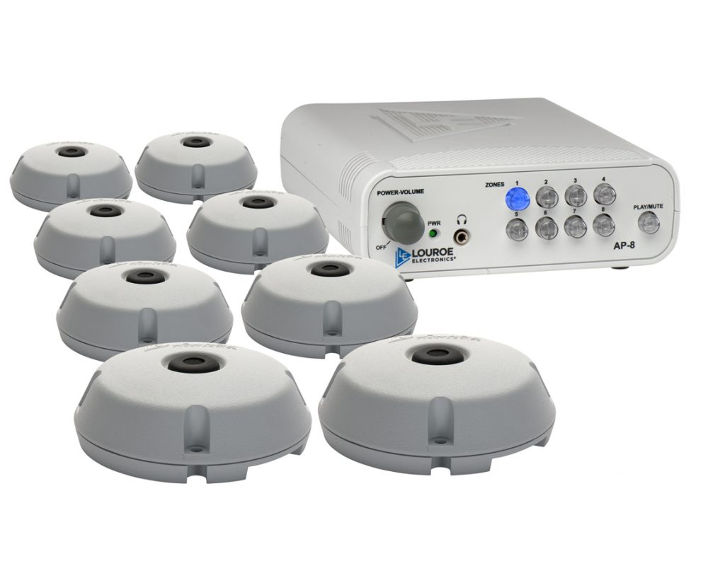 The ASK-4 #108 is a eight-zone audio monitoring system. It is designed for audio monitoring and interfacing with DVR’s, VCR’s or other audio devices that accept line level input. The microphone can be ceiling or wall mounted and provides a 30 foot diameter circle coverage. The desk top audio base station (AP-8) contains a 3" speaker for monitoring live audio and playback from a DVR or VCR. AP-8 will accommodate 8 microphones and zone selection is by pushbutton. Contains Mute/Playback switch that mutes audio from remote microphones. Microphone is pre-amplified and produces line level output.