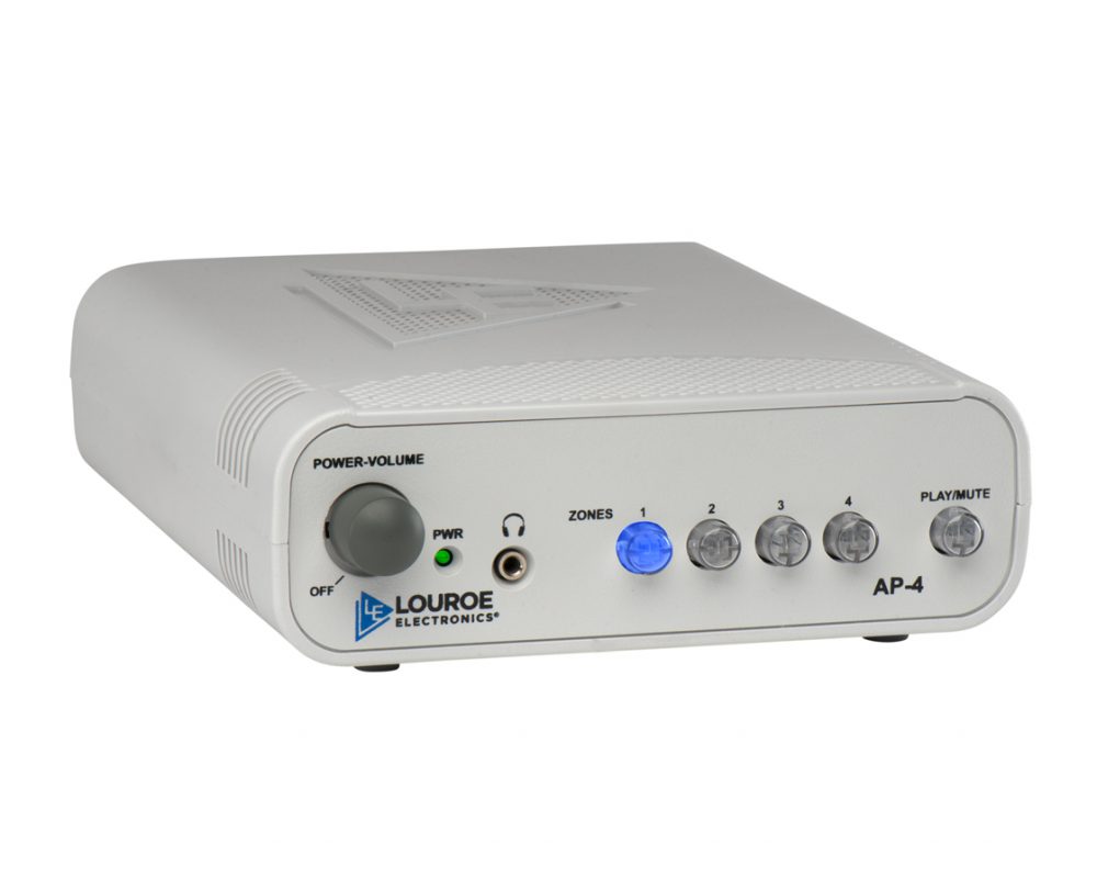 The AP-4 is a four-zone audio base station. It is designed for audio monitoring and interfacing with DVR’s, VCR’s or other audio devices that accept line level input. The unit is a desk top audio base station that contains a 3" speaker for monitoring live audio and playback from a DVR or VCR. AP-4 will accommodate 4 microphones and zone selection is by pushbutton. Contains Mute/Playback switch that mutes audio from remote microphones.