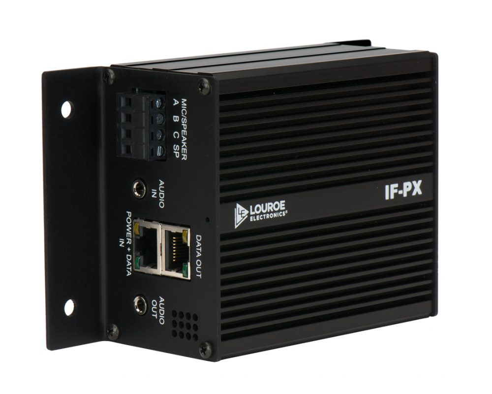 Model IF-PX is a single zone POE in-line interface designed to extracts power from an Ethernet connection to power Louroe microphones, speaker/microphones and external devices that require a 12Vdc supply such as Encoders and Non PoE IP cameras. The IF-PX supports both one-way and two-way audio. Most commercial grade line level unbalanced microphones are compatible with this unit. Audio output has variable gain control.