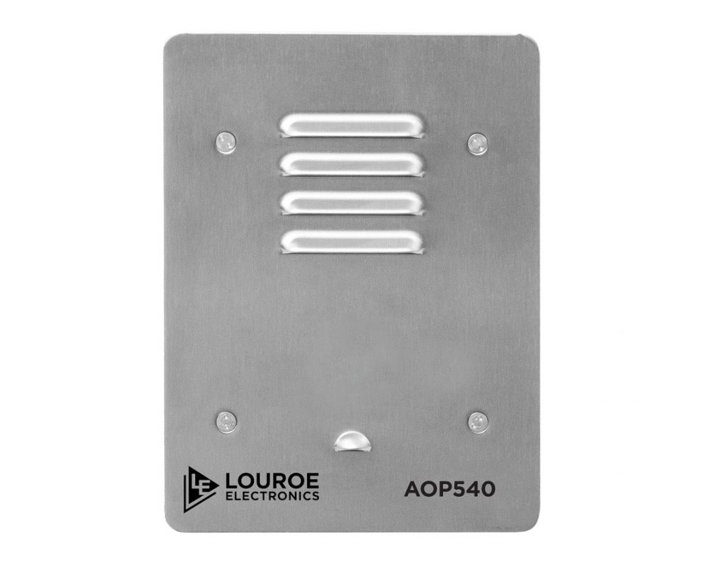 Model AOP-530 and 540 are wall mount speaker phones. The AOP-530 integrates a 5/8” illuminated call button. They are capable of full duplex communication and electronic noise cancellation. They are designed to interface with various modes of audio/video transmission systems such as IP Network Cameras, Video Encoder that accept audio, DVR’s, soundcards, etc. The units contain a built-in microphone and 2” speaker for providing bi-directional audio with the receiving source (IP network camera, etc.). Speaker volume adjustment potentiometer is located inside the unit. The AOP-530 and 540 are designed to fit into most 3-gang box enclosures and use spring clamp quick connect terminal blocks for ease of wiring and installation.