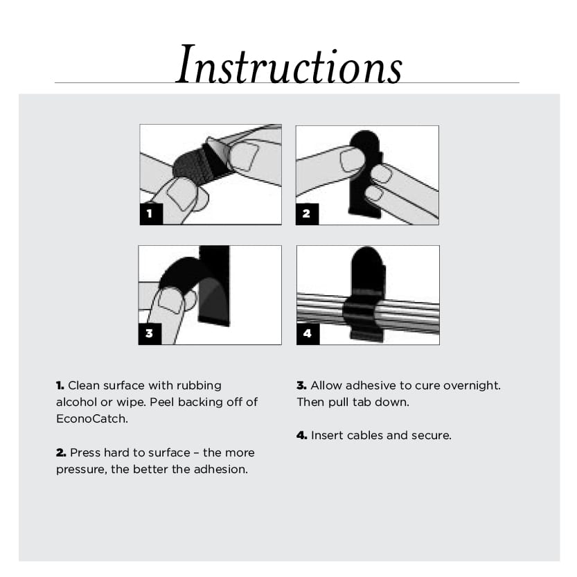 The EconoCatch organizes cables against any smooth surface. The rubber-based adhesive back allows for attachment to desks, walls, computers and other kinds of equipment.
