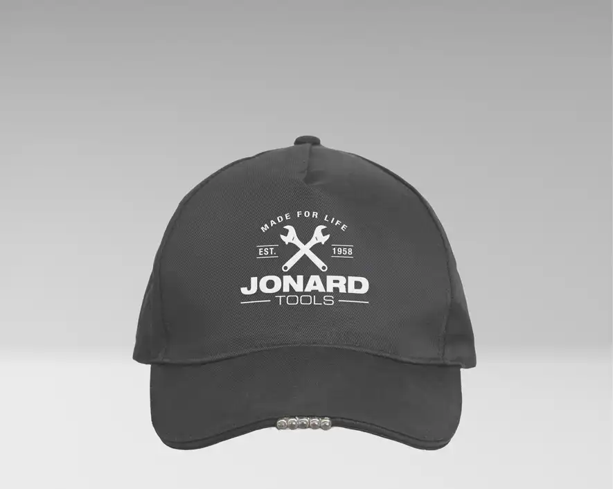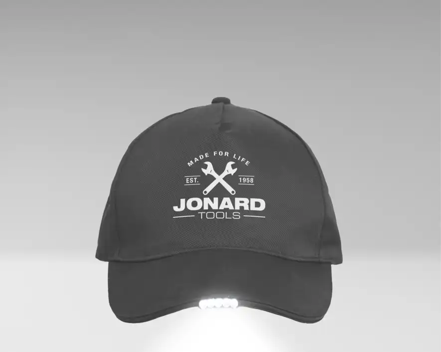 • Jonard Gray designed adjustable baseball hat. Battery operated LED light attached.