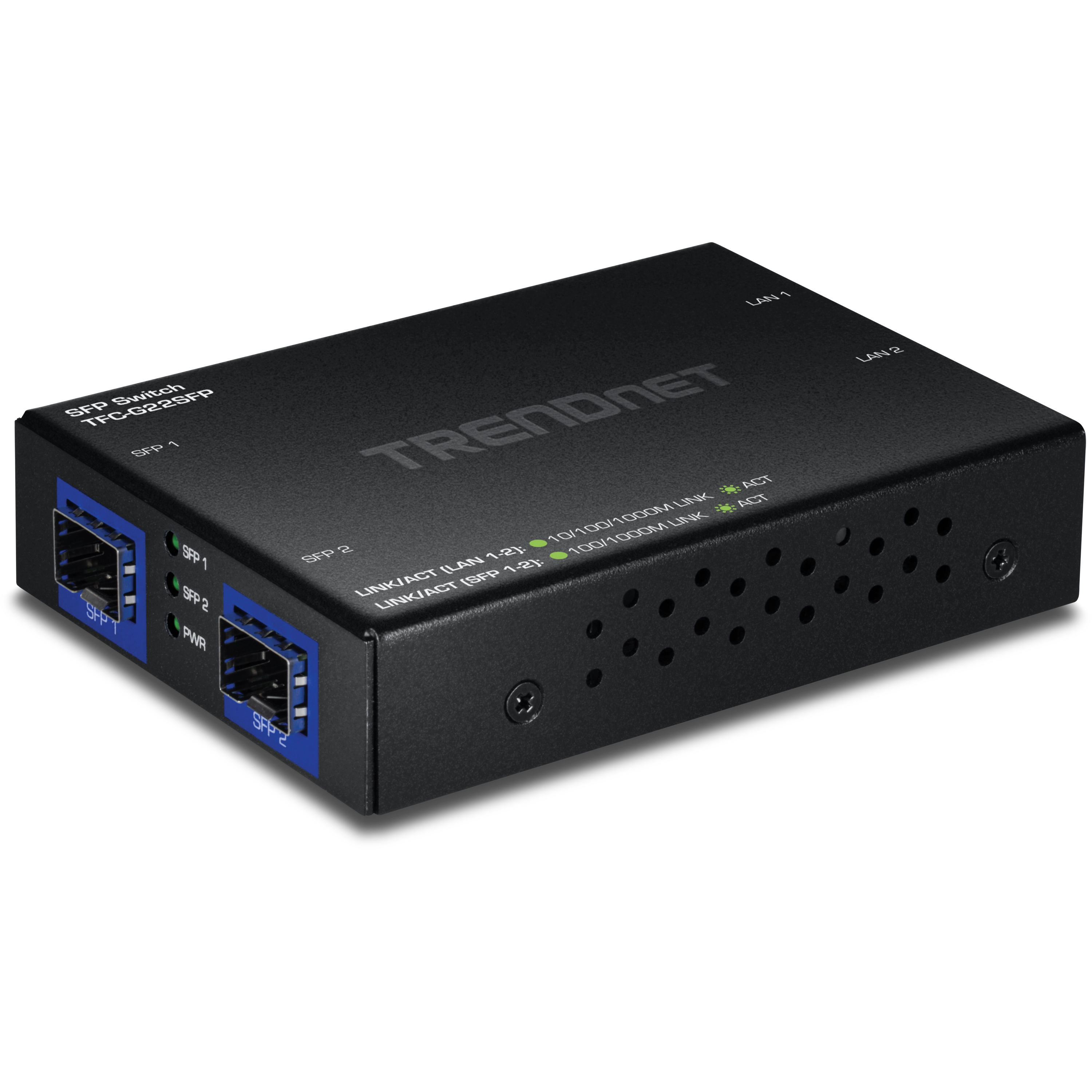 TRENDnet’s compact 4-Port Gigabit Switch with SFP Ports model TFC-G22SFP provides high-bandwidth performance, ease of use and reliability. Boost office network efficiency and eliminate congestion with gigabit speeds and a total switching capacity of 8 Gbps in full-duplex mode. Ideal for networking devices over long distances via fibre connection, this 4-port switch with SFP ports has two SFP ports. Its wall-mountable, fanless design provides installation flexibility.