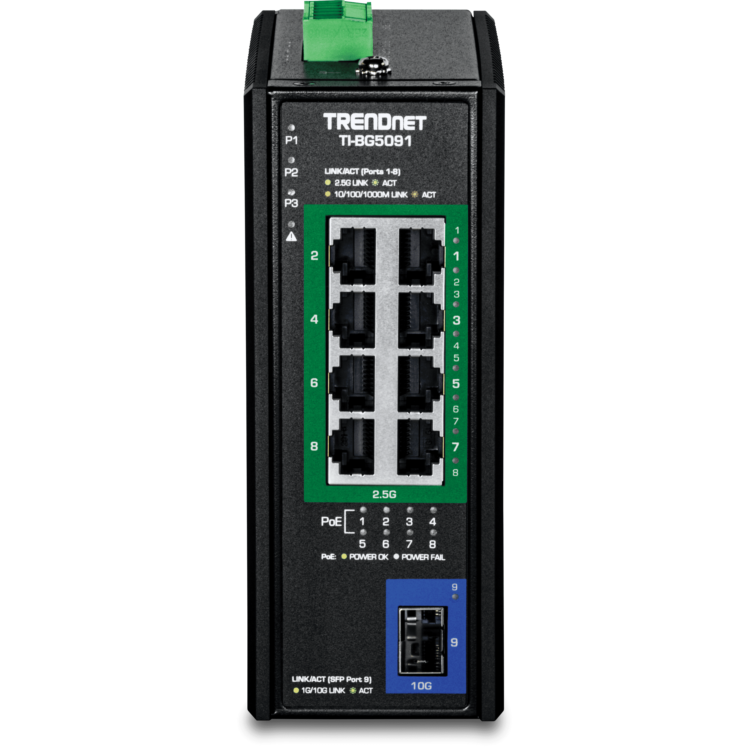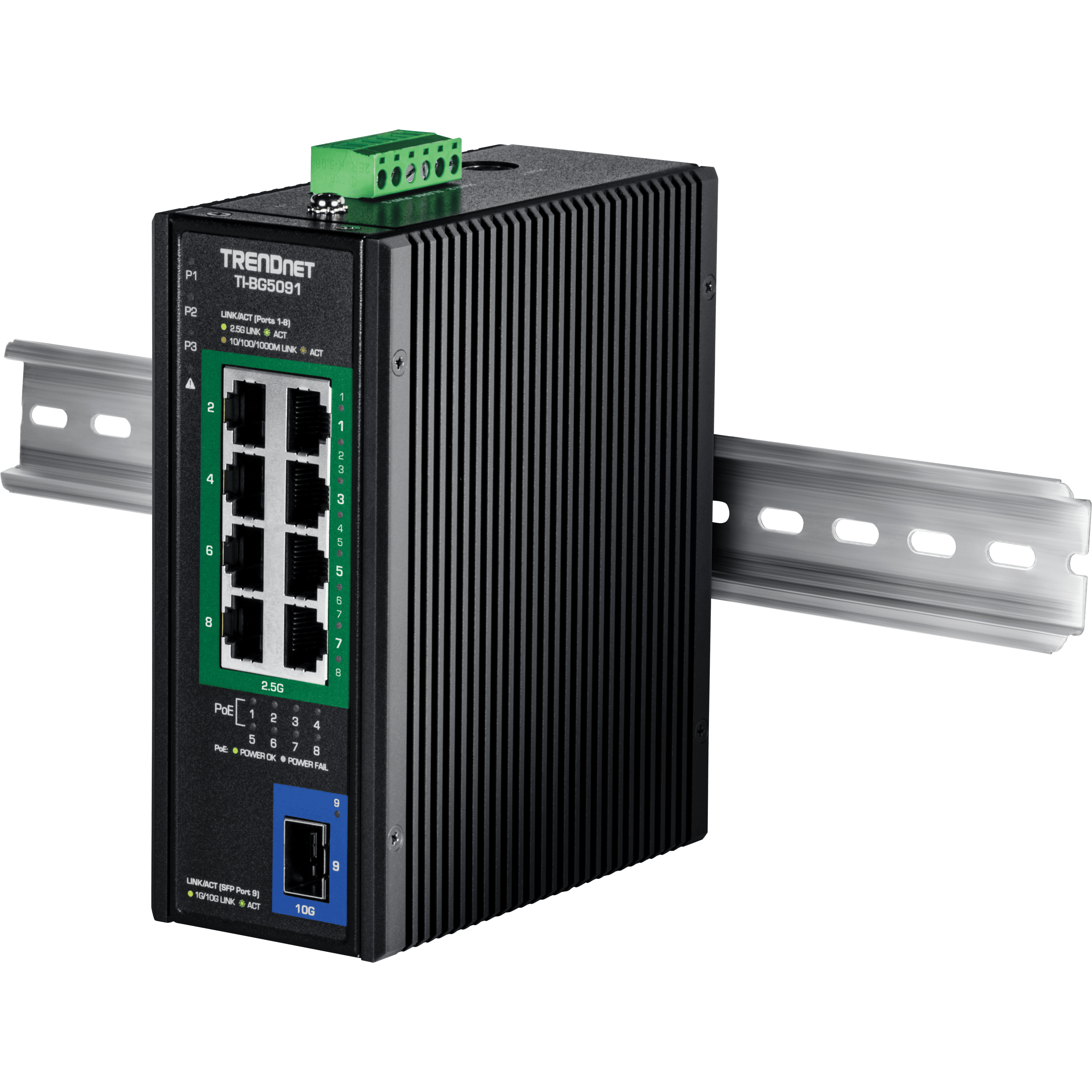 The TrendNet TI-BG5091 is a high-performance industrial PoE++ switch featuring 8 x 2.5G PoE++ ports and 1 x 10G SFP+ uplink port, delivering 60Gbps switching capacity with a massive 480W PoE power budget for high-power devices. Fast PoE technology minimizes power-up wait times for connected cameras and devices. Housed in a hardened IP50-rated metal enclosure with DIN-Rail and wall mount options, it operates reliably in extreme temperatures from -40°C to 75°C, making it ideal for outdoor cabinets, factory floors, and transportation applications. The switch supports multiple redundant power inputs with alarm output triggered by power failure for enhanced reliability. Power supplies sold separately (TI-S48048, TI-S24052, 48VDC3000). Backed by a lifetime warranty, it provides robust, high-bandwidth connectivity for demanding industrial surveillance and networking deployments requiring 2.5G PoE++ and 10G fiber uplink capabilities.