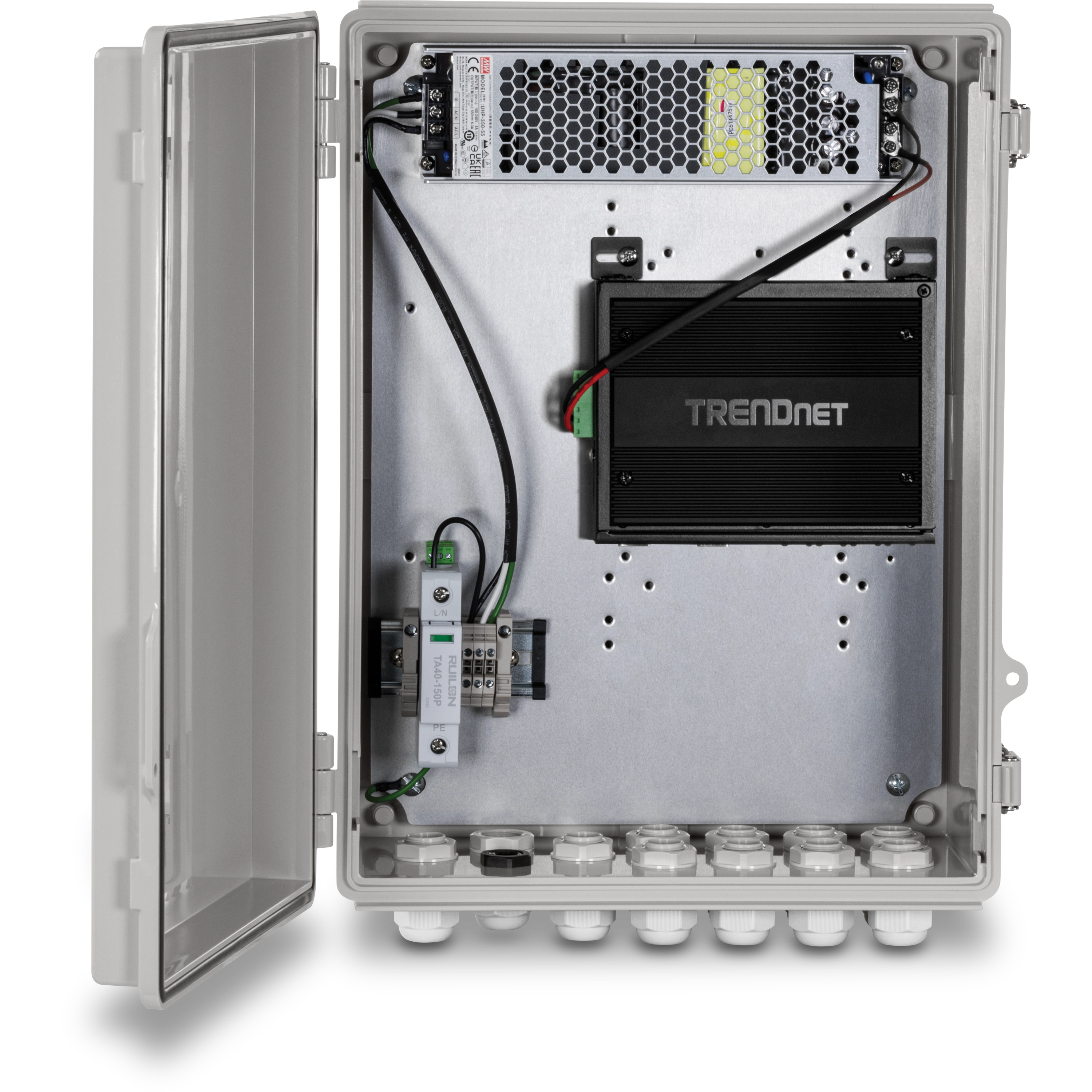 The TRENDnet Outdoor IP68 Weatherproof Enclosure with Power Supply model TI-CA4K is ideal for use with TRENDnet’s range of industrial switches, fibre converters and PoE injectors. The internal mounting holes of the outdoor network cabinet offer a secure and convenient installation method for industrial devices, protecting them from the elements. The extreme operating temperature range of -30° to 70°C (-22° to 158°F) enables installation in environments that are either very hot or very cold. This robust outdoor network enclosure comes with a power supply that can provide up to 350 W (55 V DC, 6.3 A) to industrial equipment such as PoE switches, injectors, and wireless access points.