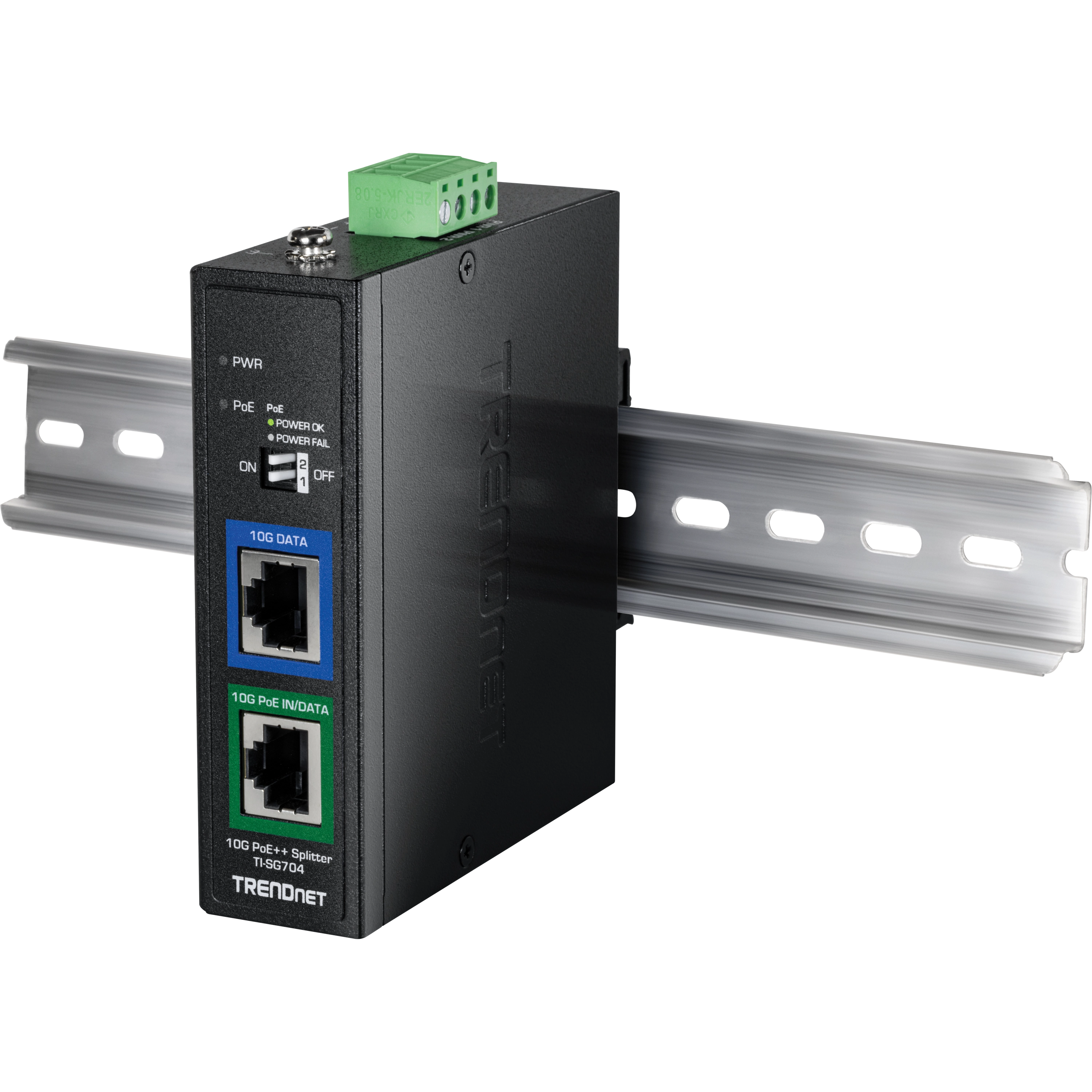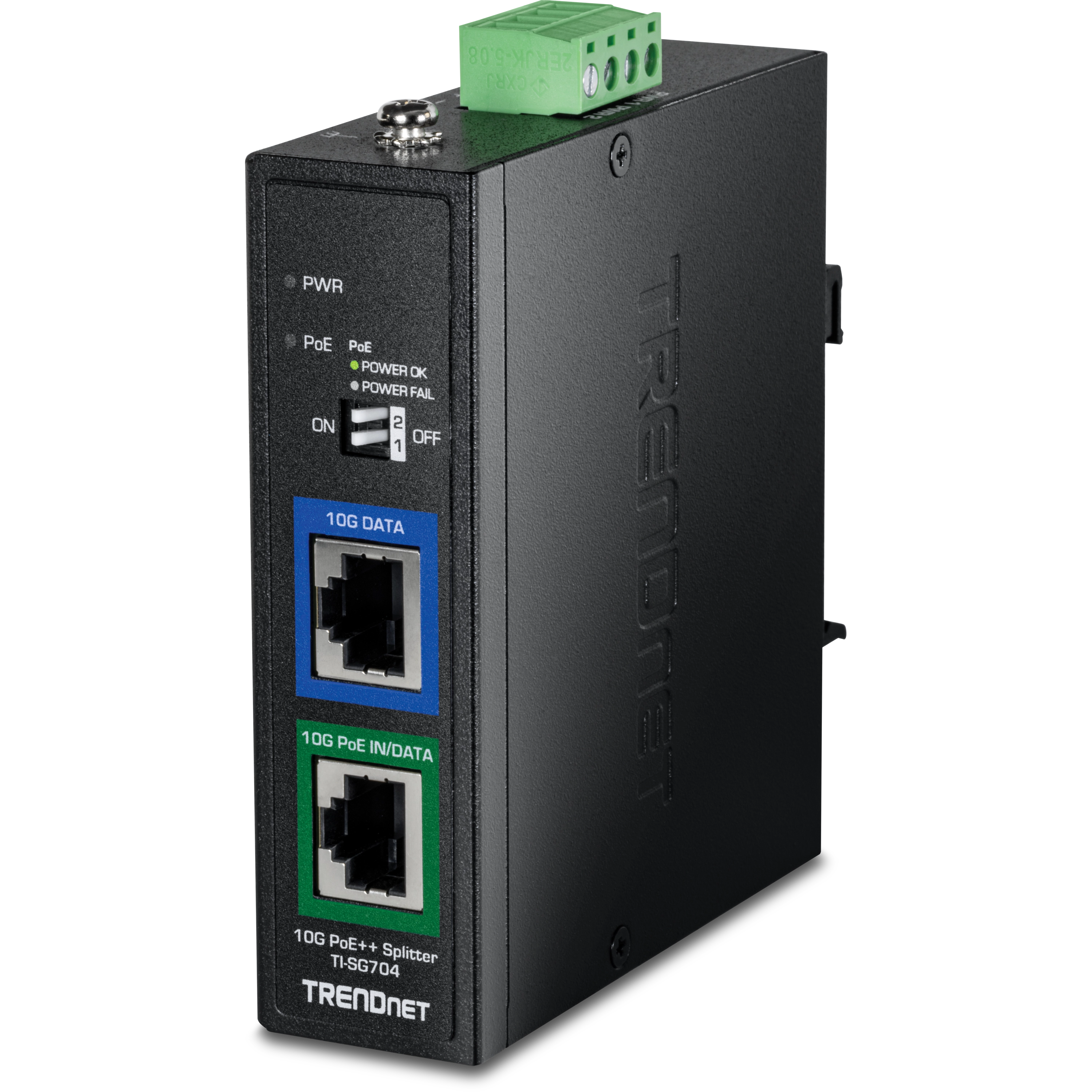The TI-SG704 Industrial 10G PoE++ Splitter from TRENDnet networks a non-PoE device using a 10G PoE++ connection, splitting it into separate DC power and data sources. The TI-SG704 can power up to two devices from a single PoE source. The convenient DIP switch adjusts the output power to 12V, 16V, 24V or 48V, matching the varying power requirements of non-PoE devices. The multiple power outputs of the industrial 10G PoE++ splitter provide greater device compatibility.