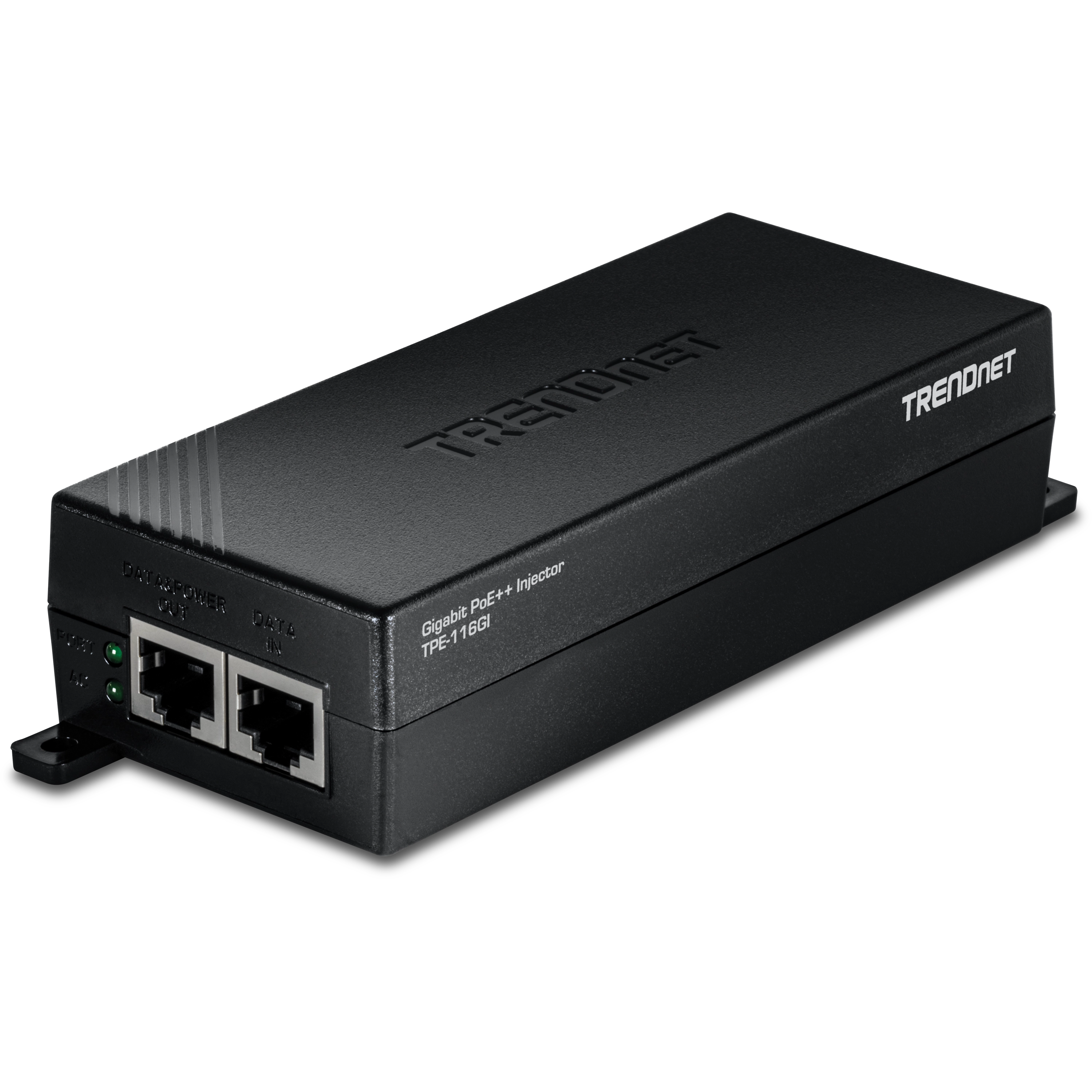 The TRENDnet Gigabit 60W PoE++ Injector TPE-116GI combines electrical power with a Gigabit network connection. Its auto-sensing technology conveniently delivers the correct wattage needed to power your PoE devices. Simply connect the PoE++ injector to a non-PoE gigabit switch and run an Ethernet cable with data and power to network a PoE device up to 100 metres (328 feet) away. You can network a variety of PoE devices, including wireless access points, IP cameras, VoIP phone systems, IPTV decoders, access controls and more.