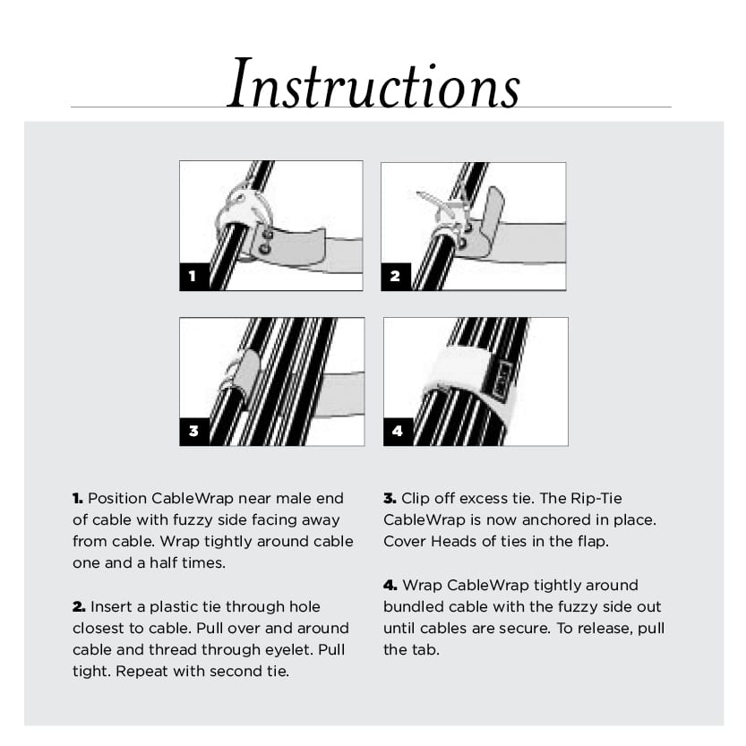 Our original patented tie, one end semi-permanently attaches to a cable, the other end has a pull-tab to fasten and unfasten the Rip-Tie with one hand.