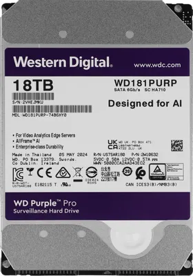 This is a high-capacity surveillance hard disk drive designed for 24/7 operation in advanced Network Video Recorder systems. The 18TB WD Purple model combines a 7200 RPM spindle speed with a SATA III interface, achieving a sustained transfer rate of up to 272MB/s for handling multiple high-resolution video streams. It uses reliable Conventional Magnetic Recording technology and is equipped with 512MB of cache for improved performance. Engineered for surveillance workloads, it features AllFrame technology to reduce video frame loss and is optimized for compatibility with AI-enabled analytics. It operates within a temperature range of 0°C to 65°C. The drive is backed by a 5-year limited warranty and holds major international certifications, including CE, FCC, and UL.
