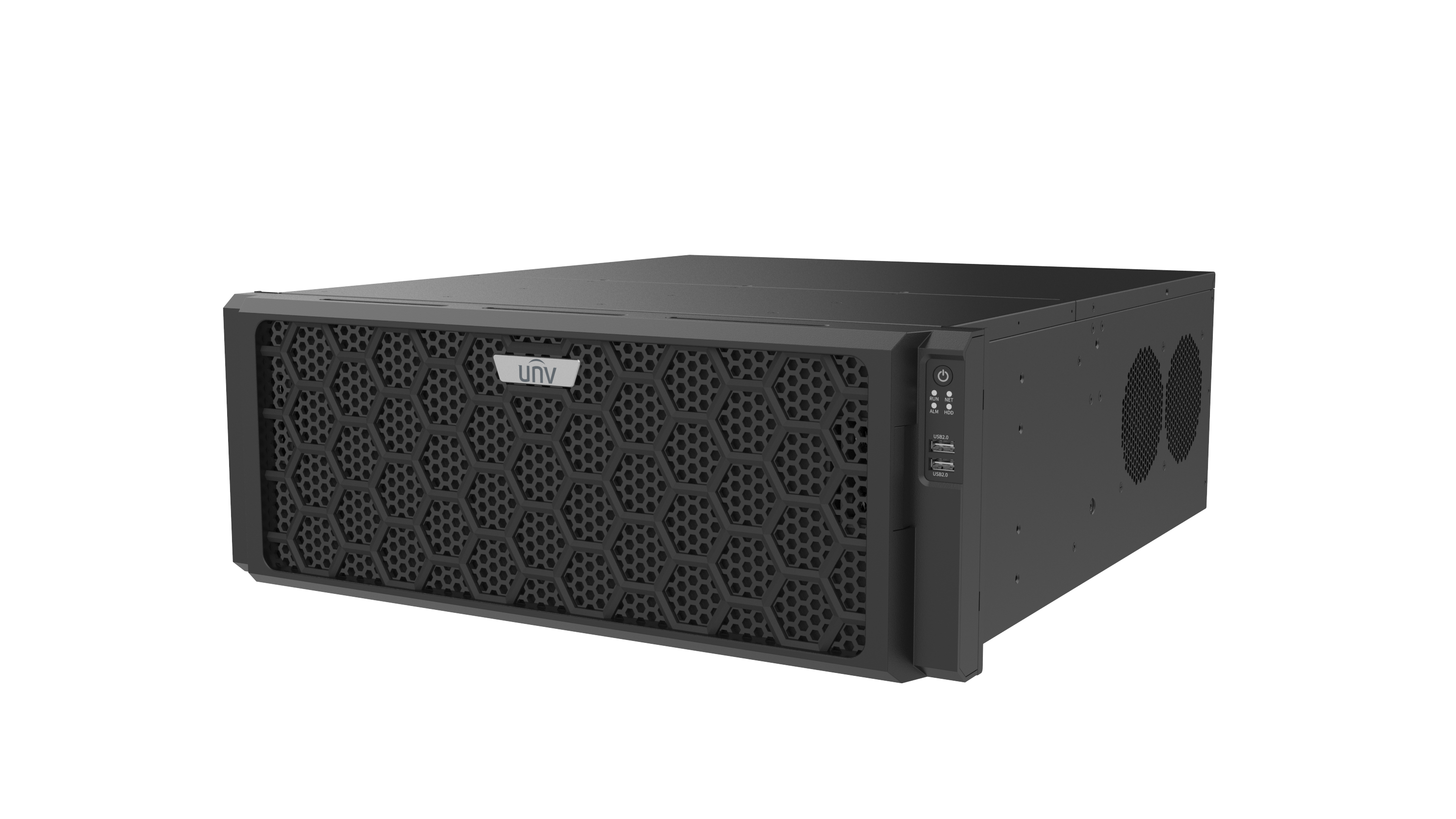 This is an enterprise-grade 128-channel network video recorder. It supports Ultra 265, H.265, and H.264 video compression and offers high decoding performance, such as 8 channels of 4K video at 30 fps. It has an incoming/outgoing network bandwidth of 640 Mbps. The device features 24 hot-swappable SATA hard drive bays for extensive storage and includes 16 alarm inputs and 10 alarm outputs.